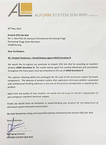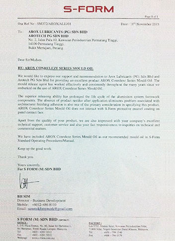 AROX LUBRICANTS / AROTECH were called in to provide solution. We rectified the problem which caused the major issues by other Mould oils and created a new formulated Mould Release Agent to resolved the issues. The Conreleze series performed very good and assessed by Aluminium Formwork Manufacturers with nominated as one of international standard.